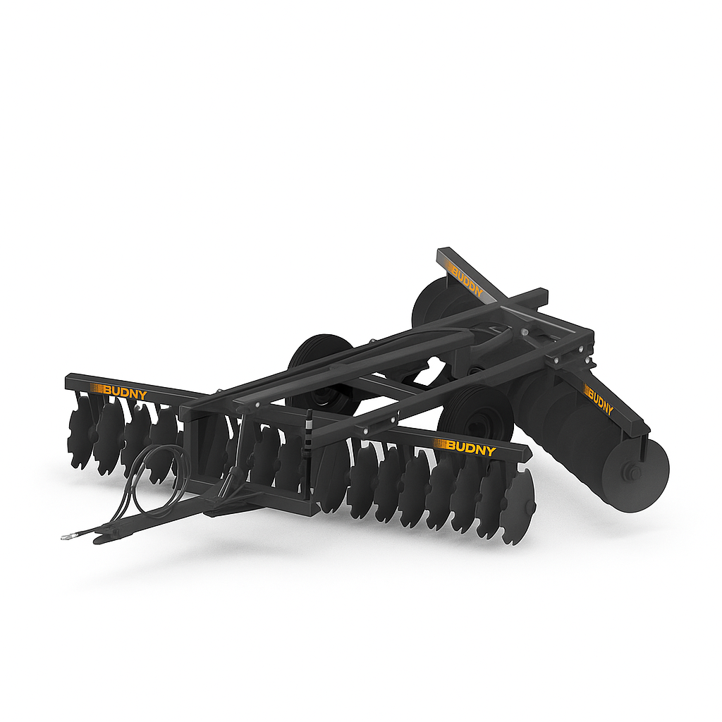 A Grade Niveladora Budny com Controle Remoto realiza nivelamento e destorroamento do solo com precisão. Disponível de 24 a 36 discos, com estrutura reforçada e acionamento hidráulico.